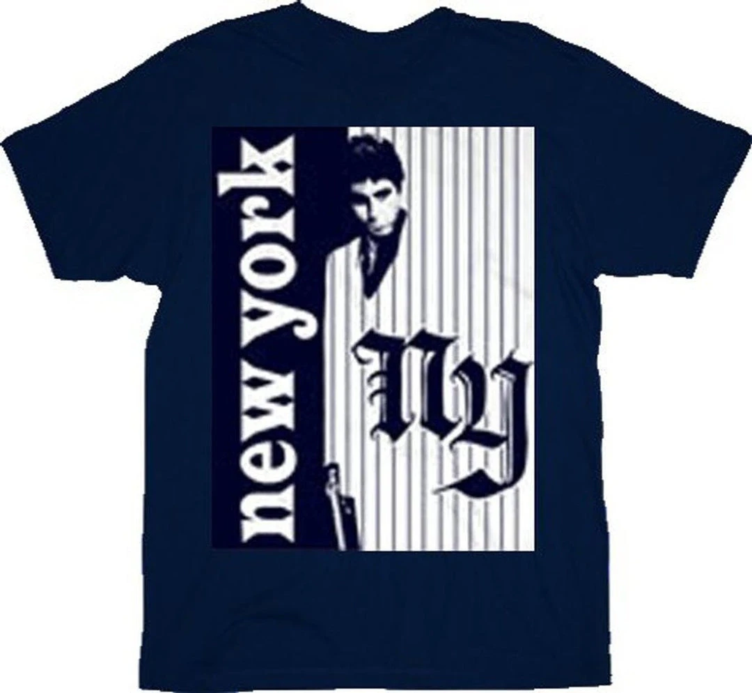Tony Montana may have called Miami home, but on the streets of New York, he’s an icon. Represent the Big Apple and Brian DePalma’s gangster classic at the same time with this officially licensed “Scarface” t-shirt. Al Pacino’s famous pose from the “Scarface” movie poster is recreated on the front of the tee, splashed with Yankee pinstripes.