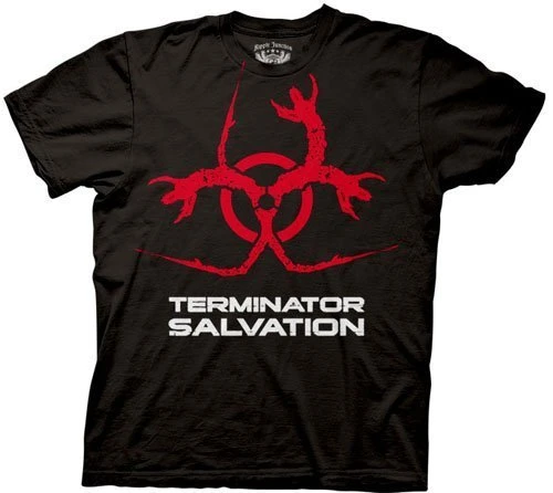 Pay tribute to the latest “Terminator” sequel with this black cotton “Terminator: Salvation” t-shirt. The tee features a red cybernetic biohazard symbol on the chest.