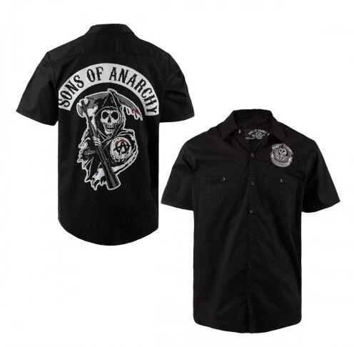Are you looking for something unique and rebellious to wear around your workplace? Well, look no further than this officially licensed Sons of Anarchy workshirt! Featuring the Reaper logo on the back and front, this SOA shirt is sure to be an eye catcher. Let the world know who your favorite biker gang is with this totally awesome SAMCRO shirt based on the wildly entertaining television show from FX!