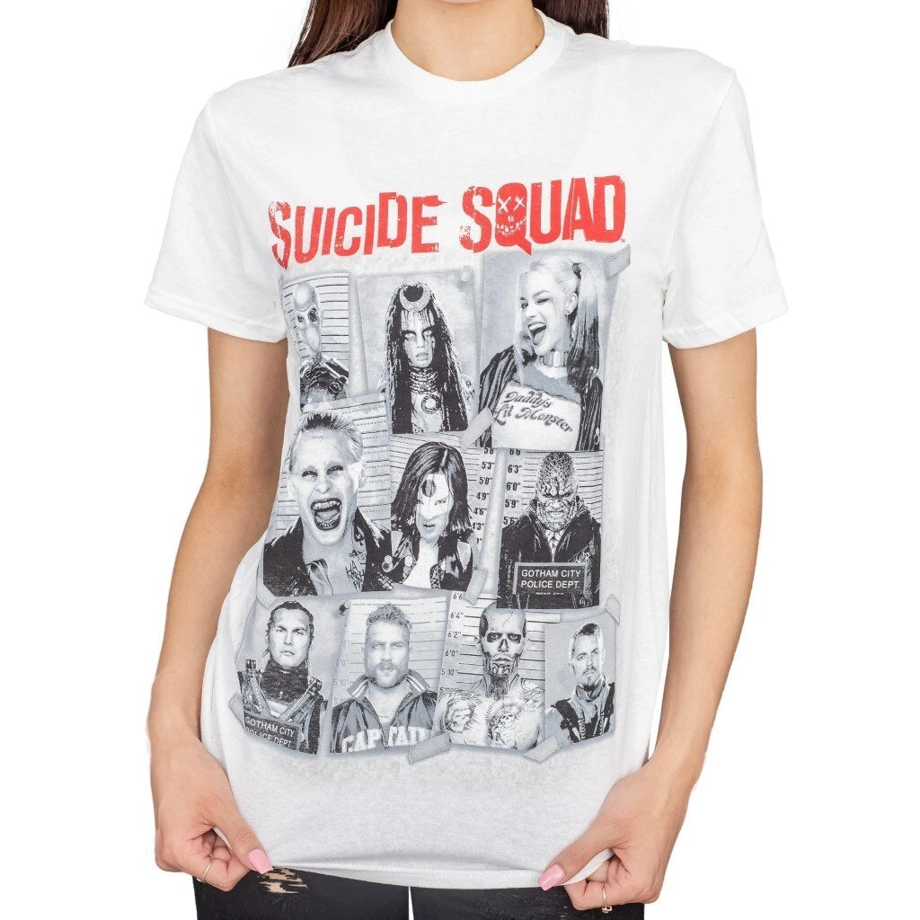 Wanted: All Members of Suicide Squad. This officially-licensed Suicide Squad Mugshots tee will show everyone just how much you love Harley Quinn, Dead Shot, Rick Flag, The Joker, El Diablo, Killer Croc and the others when you wear it to your next comic con or geeky-gathering.