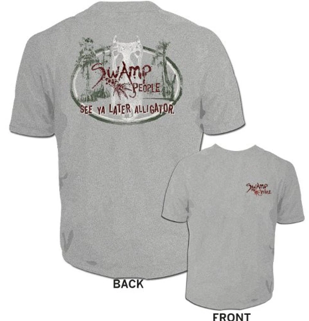 If you’re a fan of Swamp People, chances are you’ve seen Alligators slip through a few fingers. But there’s no need to fret, because these seasoned professionals will get their gator one way or another. This officially licensed t-shirt features the Swamp People logo with the phrase ?See ya later Alligator.?
