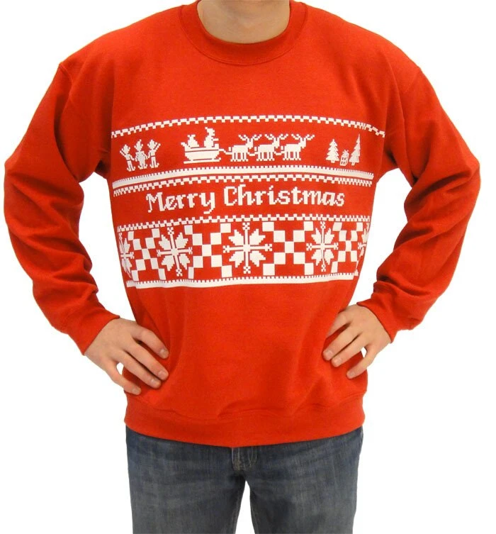 What better way to say Merry Christmas than with this hilariously bad holiday sweater? Featuring Santa’s elves seeing him off on his long sleigh ride, this atrocious Christmas sweater is so bright and festive that its sure to make some passers by feel a bit ill. If your eyes aren’t already burning from this combination of bright red and white, this ugly Christmas sweater is the perfect choice to bring a little holiday cheer to your family and friends!