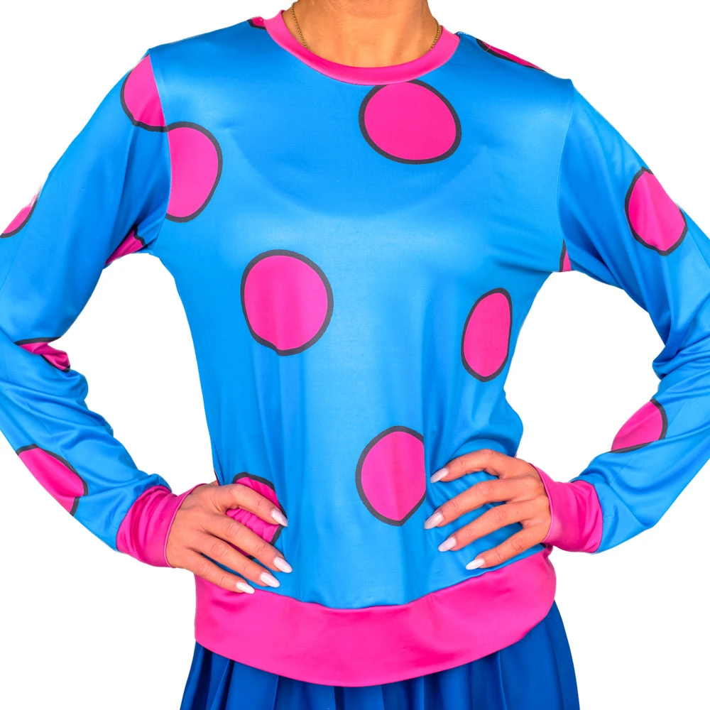 - Costume includes a long sleeve blue t-shirt, a blue skirt with elastic waist, a yellow wig, and an adjustable felt shoes for different size shoes.