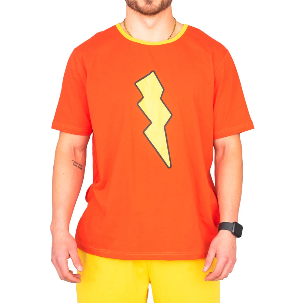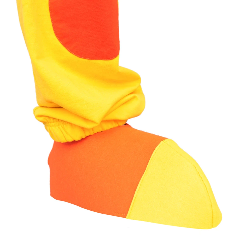 - Costume includes a red short sleeve t-shirt, a yellow pants with 2 side pockets, and 1 back pocket, an adjustable felt shoe cover with strap on back to adjust for different size shoe.
