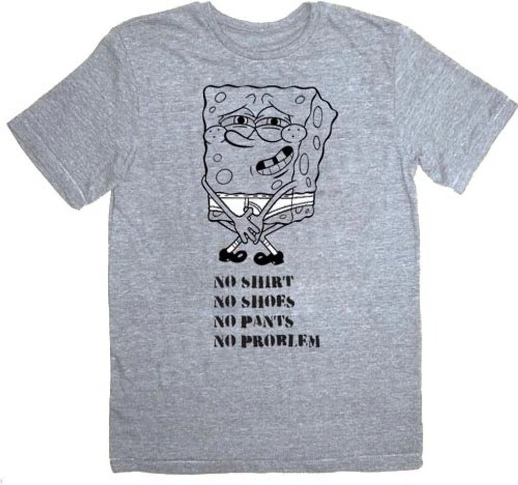 Fashions in Bikini Bottom aren’t as conservative as you might think! Let the world know you’re only slightly less prone to misplacing your attire than SpongeBob himself with this officially licensed t-shirt! The heather gray tee features a bashful Spongebob covering his shame and reads, “No shirt, no shoes, no pants, no problem.” It’ll look great at the pool, the beach, or your youngest daughter’s christening.