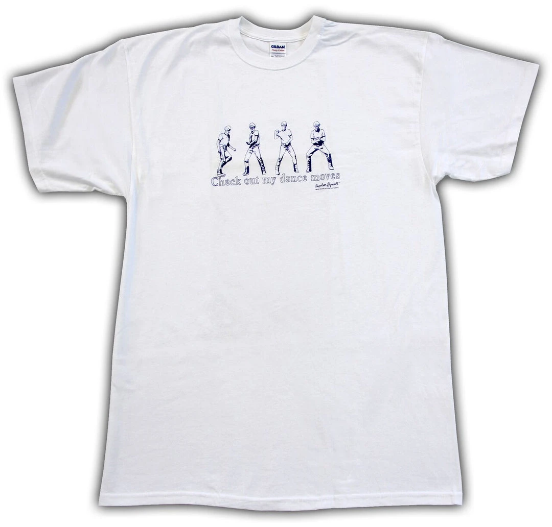 Everyone you meet will feel strangely compelled to vote for Pedro every time you wear this officially licensed “Napoleon Dynamite” t-shirt! The white tee features Napoleon’s unforgettable dance steps from the film’s climax. The quote, “Check out my dance moves,” is printed beneath.
