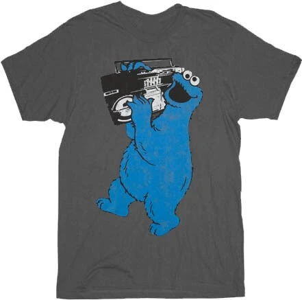 This tee features a hip Cookie Monster rockin out to a boombox.