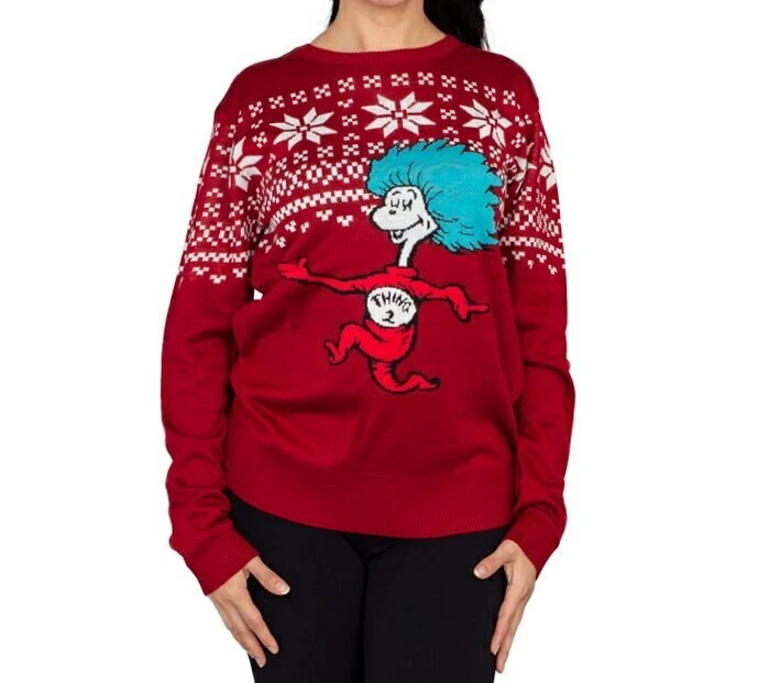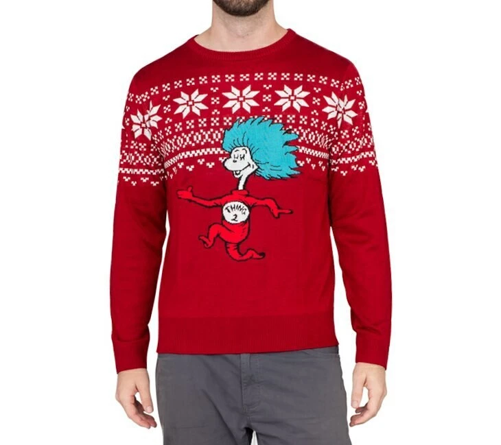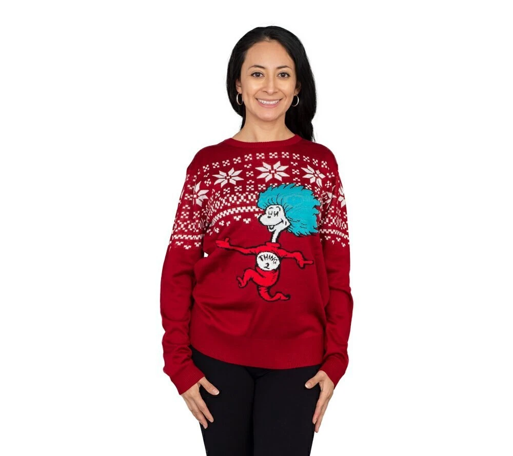 Are you thing 1? No, you’re definitely thing 2! Let everyone at the Christmas party know that you’re a fan of Dr. Seuss with this funny and ugly holiday sweater! Featuring one of his most well known characters, this officially licensed Dr. Seuss sweater is perfect for any fan. With a simple snowflake border along the top, this Thing 2 sweater is sure to be a contender for any ugly Christmas sweater contest!