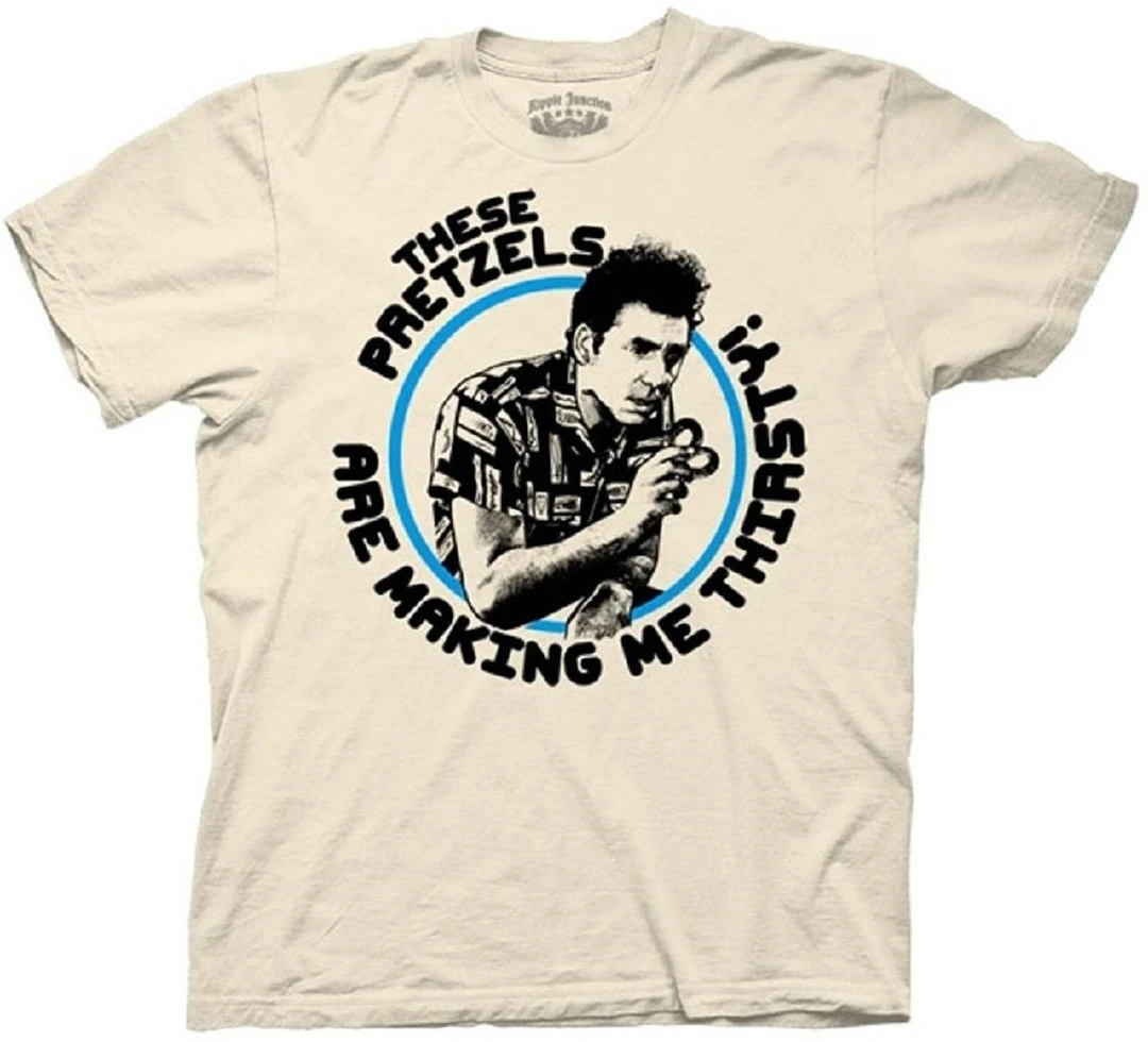Celebrate Kramer’s brief film career with this officially licensed “Seinfeld” t-shirt! The white cotton tee features an image of Kramer alongside his famous quote from the Seinfeld episode, “The Alternate Side,” where Kramer screws up his only line in a Woody Allen movie.