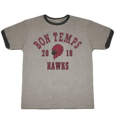 Celebrate another season of Deep South pigskin with this officially licensed “True Blood” t-shirt! This ash gray ringer tee is similar to the shirt worn by Jason Stackhouse in the popular HBO drama. The red script reads “Bon Temps Football 2010” and features a print of a BTHS Hawk. Show off your “True Blood” fandom stealthily with this cool, comfortable classic.