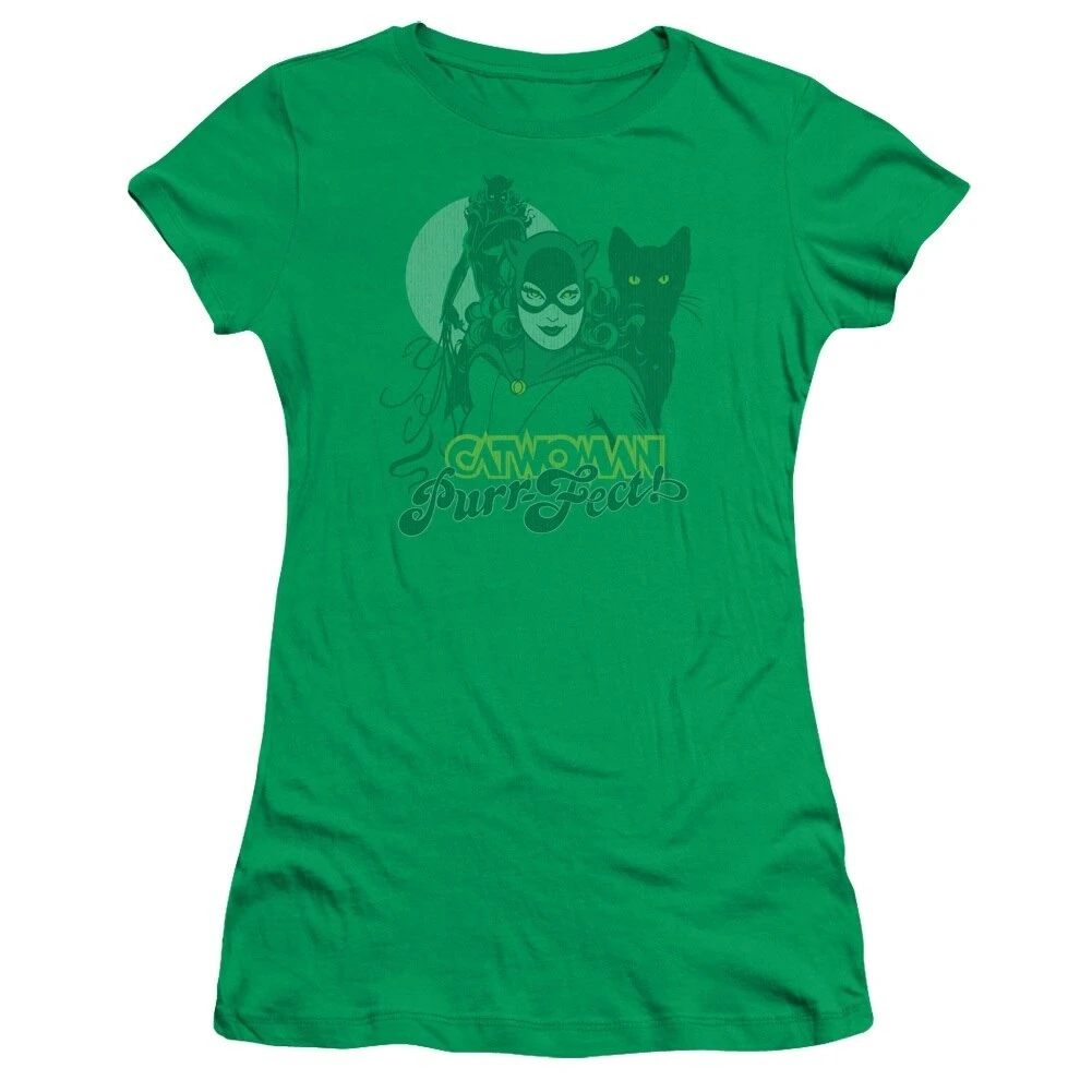 Rowr! This sexy fitted Catwoman t-shirt features the original feline fatale and her famous catchphrase, “Purr-fect.” Instantly turn any woman into a slinky super-villain with this vintage-look tee.