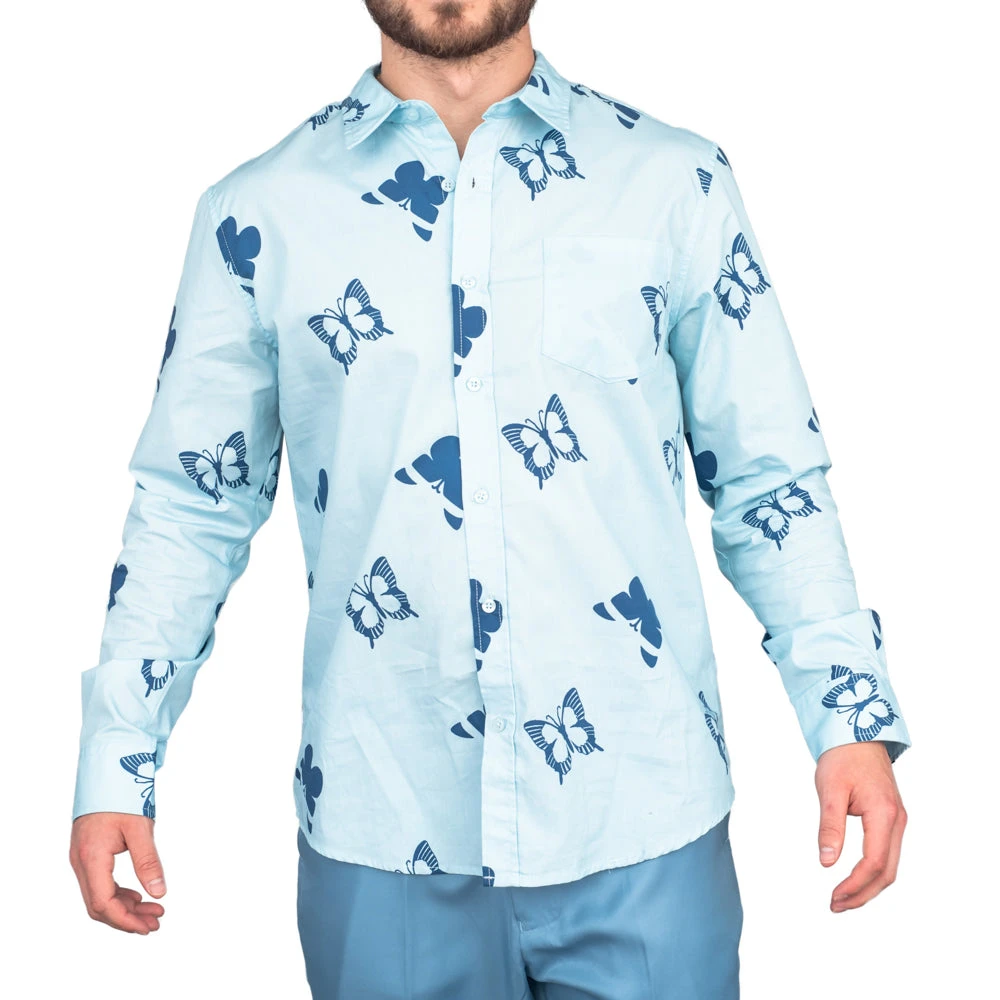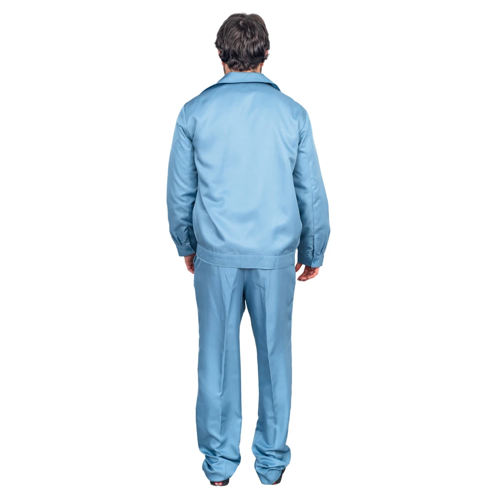 - Includes an adult unisex blue button-up jacket, pants, and a long-sleeve button-up shirt. Does not include anything else.