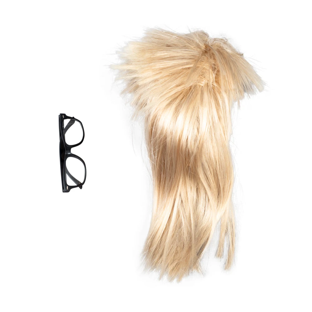 - Wayne’s Kit includes a black wig with an adjustable hat. Garth’s Kit includes a blonde wig with black frame glasses. Does not include anything else.