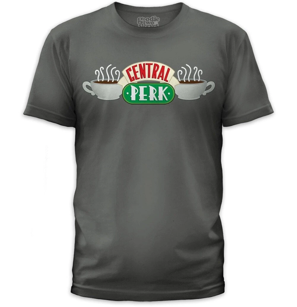 Celebrate the safest, coziest spot in Manhattan with this officially licensed “Friends” t-shirt! The blue cotton tee features the cheerful logo of Central Perk, the comfy coffee shop that was the preferred hangout for friends Ross, Rachel, Monica, Chandler, Joey, and Phoebe. Slip on this comfortable tee and grab a giant mug of coffee, and don’t be surprised if you find yourself humming “Smelly Cat.”