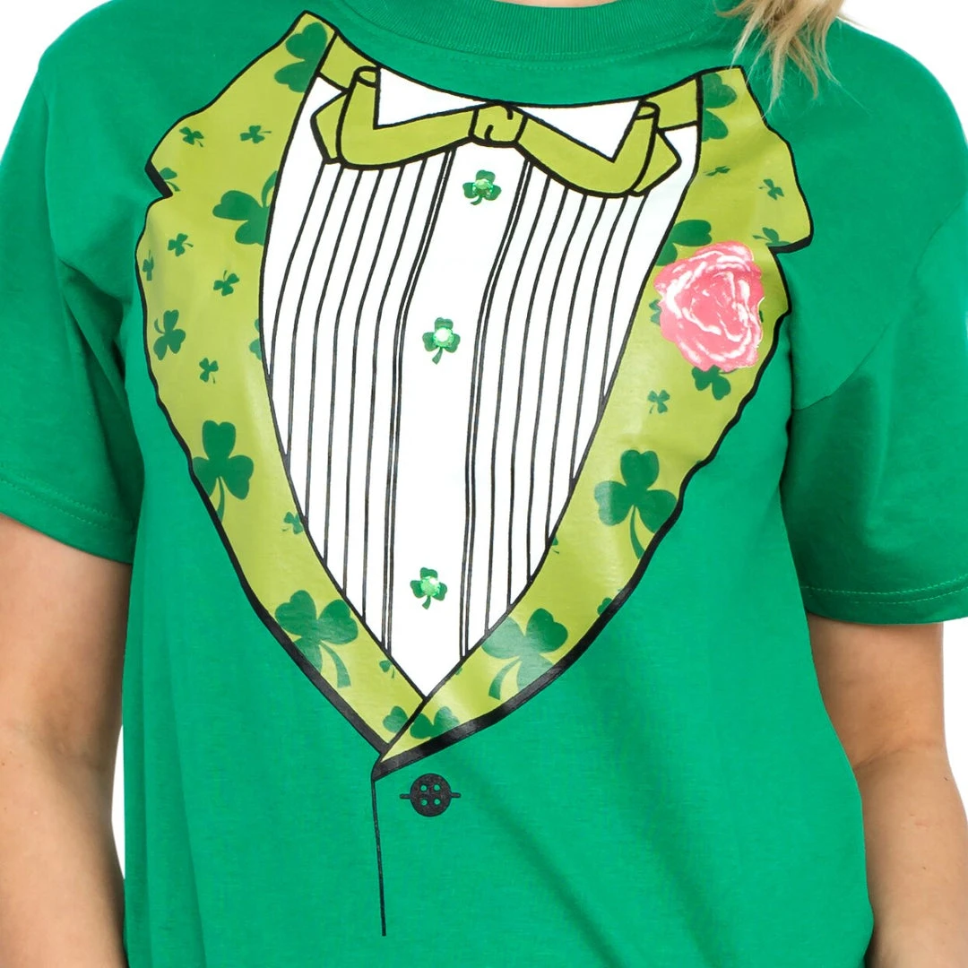 Features all of your necessary tuxedo details on a t-shirt! Green rhinestones are featured as buttons.